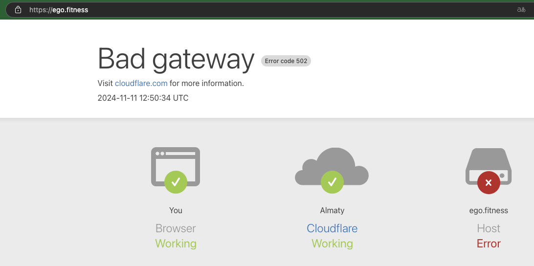 На 11 ноября 2024-го года при попытке зайти на платформу «Эго Фитнес» появляется заглушка Cloud Flare. Она содержит ошибку Bad gateway. Это означает, что сервер запрашиваемого ресурса не отвечает.