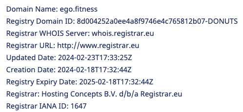 Чтобы выяснить, когда ресурс Ego Fitnes заработал, мы запросили данные его доменного имени из сервиса Whois. Обнаружили, что он было зарегистрировано 18 февраля 2024-го года.