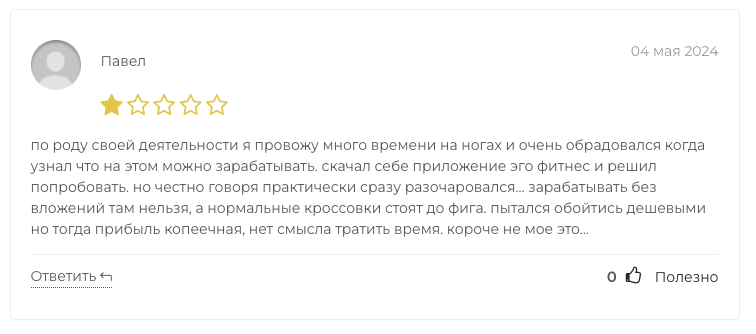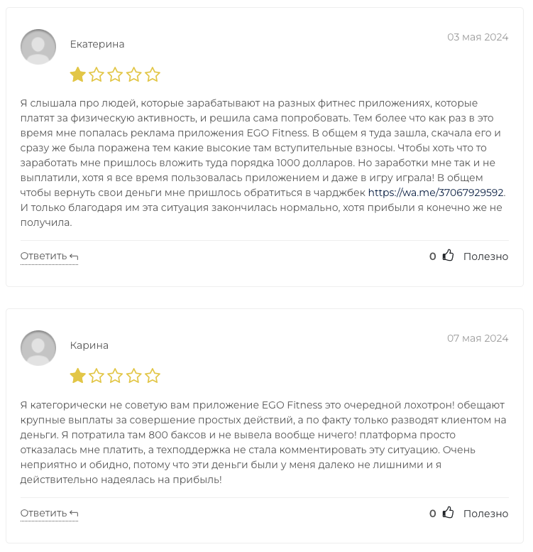 Отзывы о Ego Fitnes в интернете исключительно негативные. Например, некая Екатерина пишет, что для заработка в этой системе вложила около 1000 долларов. Но получить обещанные награды от создателей приложения ей не удалось.