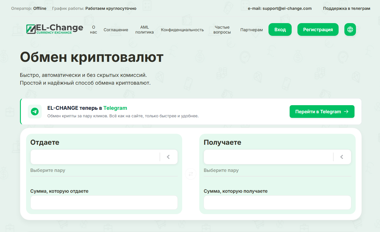 Официальный сайт обменника El Change Me – el change me. Версия на английском языке – en el change me. Заявляет о надежном, быстром и выгодном обмене криптовалют. Заявки обрабатываются в автоматическом режиме, что обеспечивает высокую скорость обработки транзакций. Доступны популярные монеты, включая Bitcoin, Litecoin, Dogecoin, Ethereum, Tether USDT, Tether ERC, Tron, Monero.