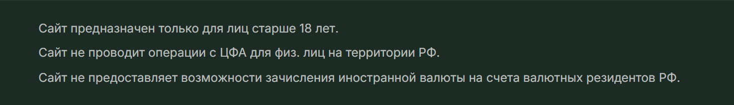 На сайте отмечено, что обменник не принимает заявки от физических лиц на обмен криптовалют на территории России. Также он не зачисляет иностранные валюты на счета российских граждан. Судя по условиям реферальной программы, где вывод в рублях, сервис все же сотрудничает с россиянами. Или же владельцы дают противоречивую информацию.