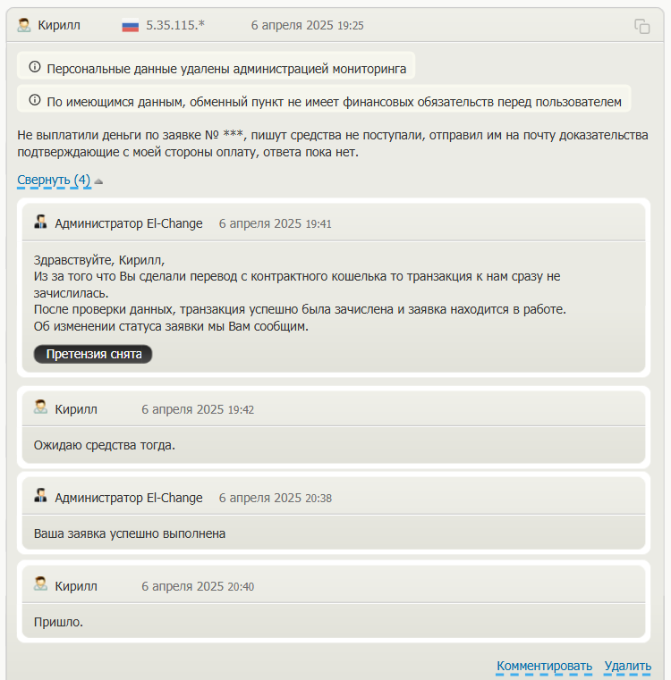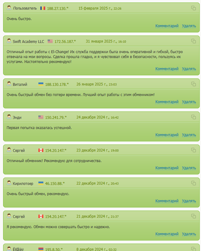 Отзывы о платформе el change me в сети в основном положительные. Люди отмечают оперативность обмена. Судя по многочисленным отзывам от россиян, обменник все-таки работает с резидентами РФ.