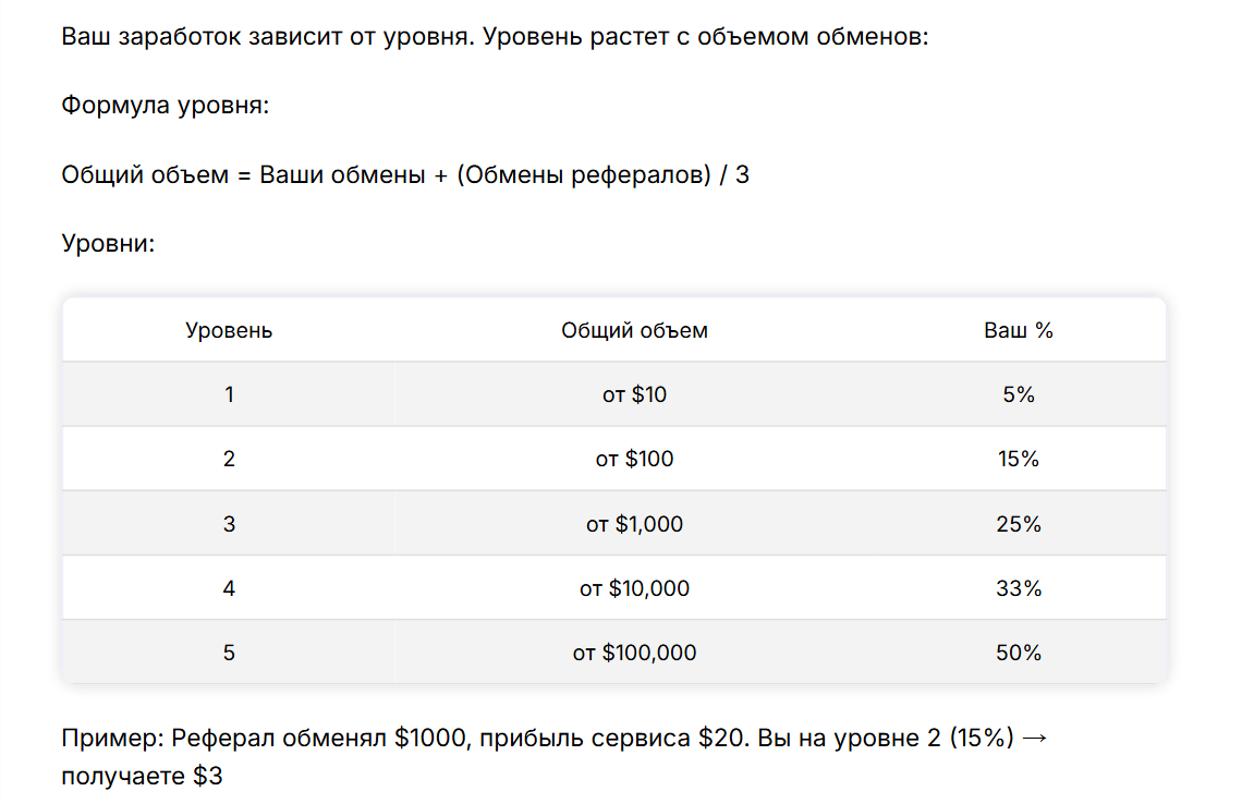 Обменник El Change Me предлагает участие в партнерской программе. Размер вознаграждения – от 5% до 50% в зависимости от уровня пользователя, который повышается по мере увеличения объема обменов. Минимальная сумма вывода – 10 долларов. При этом выводить можно только в рублях на банковскую карту. Также доступен вывод на криптовалютный кошелек.