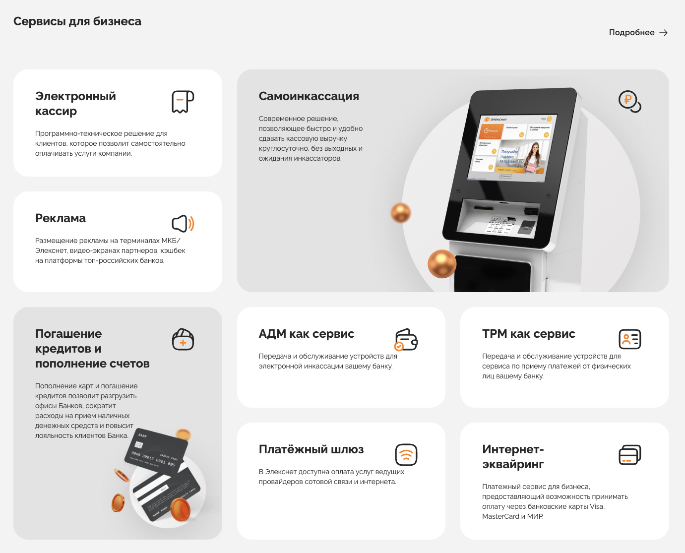 Владельцам бизнеса компания elecsnet ru предоставляет не только платформу самообслуживания их клиентов, но еще и дополнительные услуги: инкассацию, рекламу и т.п.