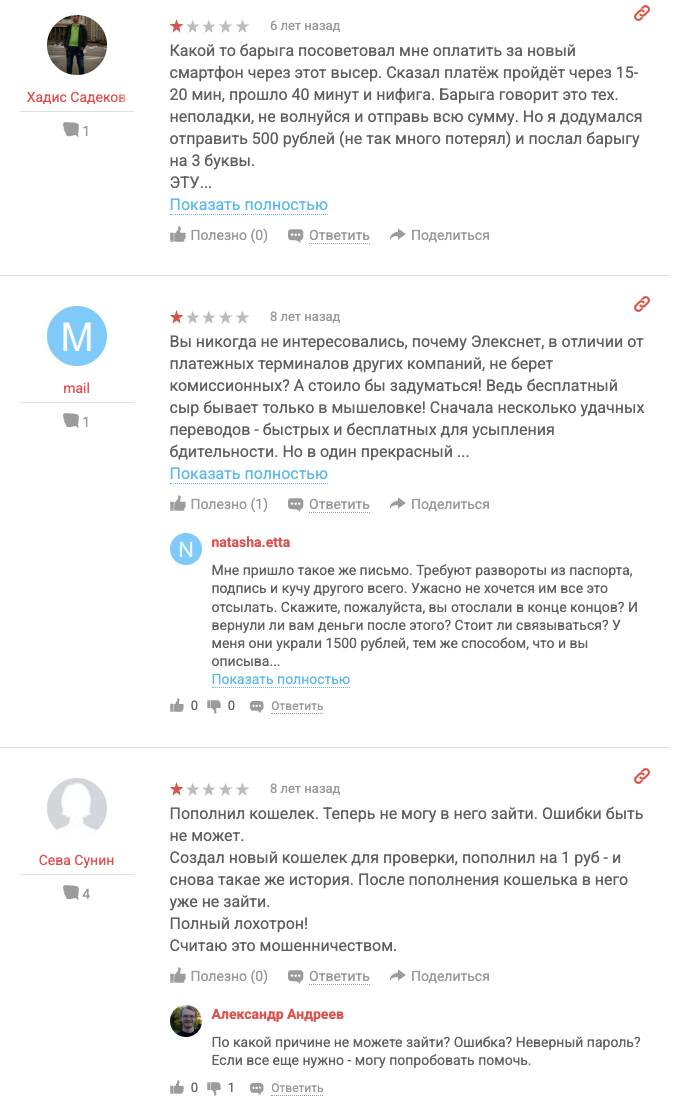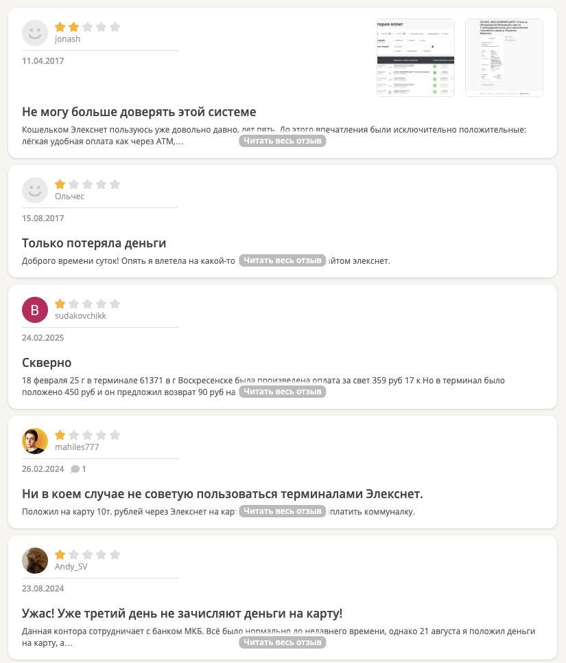 Отзывы клиентов о компании АО НКО «ЭлексНет» в интернете преимущественно негативные. Чаще всего пользователи недовольны тем, что внесенные через терминалы ElecsNet деньги не дошли до получателя.