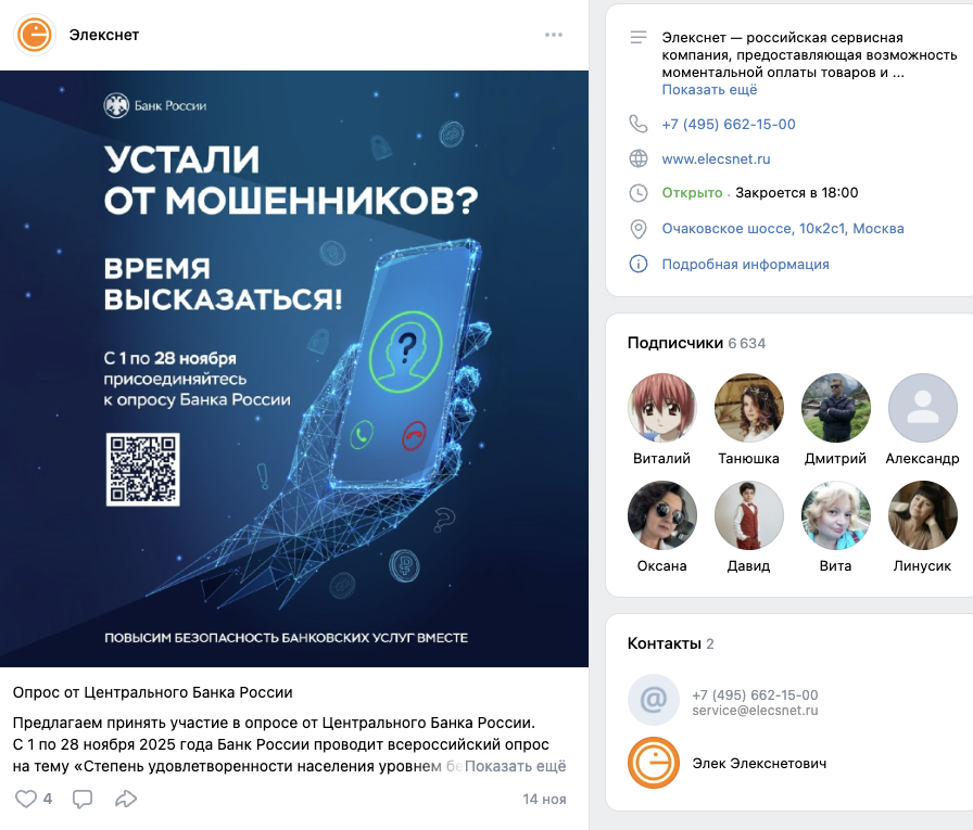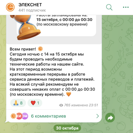 На телеграмм-канал «Элекснет», находящийся по адресу elecsnet1, на 1 декабря 2025-го года, подписан 441 пользователь. Публикации на ТГК собирают в среднем по 600-800 показов, 7-10 реакций и несколько комментариев.