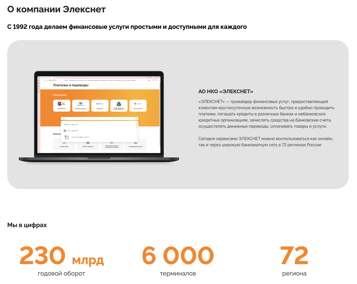Согласно приведенным на сайте elecsnet ru данным, годовой оборот средств через систему «Елекс Нет» составляет 230 миллиардов рублей. Сервис «ЭлексНет» интегрирован в 6 тысяч терминалов, которые установлены в 72 регионах РФ.