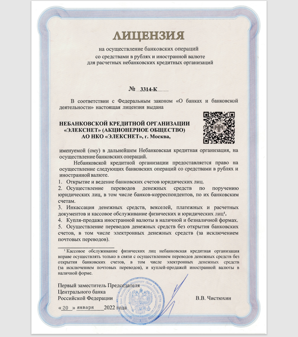 Сервис работает от лица АО НКО «Элекснет». Она имеет лицензию от ЦБ РФ, номер которой № 3314-К. Он успешно бьется бьется на сайте Центробанка.
