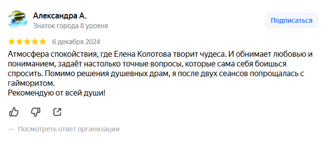 Стоит отметить, что отзывы на психологические консультации от Колотовой положительные. Клиенты отмечают профессионализм женщины и ее деликатный подход к проблеме.