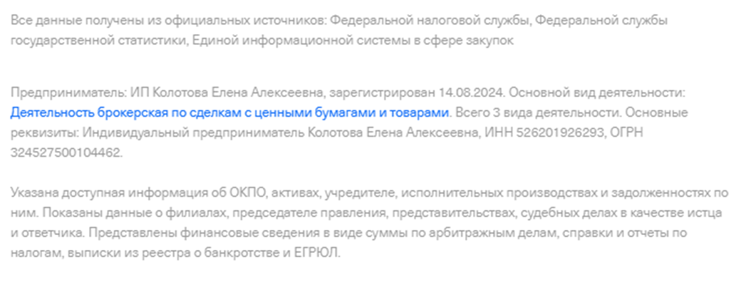 Единственные упоминания об инвесторе Елене Колотовой нашлись на сайте Т-Банка, где женщина зарегистрирована как индивидуальный предприниматель, которому разрешена брокерская и инвестиционная деятельность.