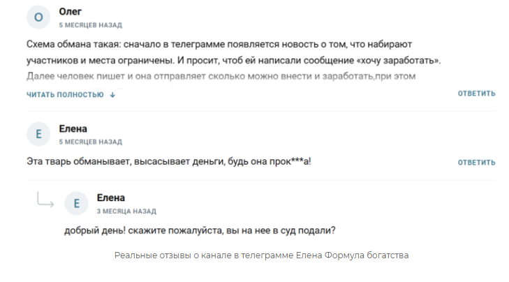 Отзывы от резко разбогатевших клиентов Елены отсутствуют, зато мнения о том, что ведущая является типичной мошенницей можно встретить как в обзорах о канале, так и в комментариях пользователей.