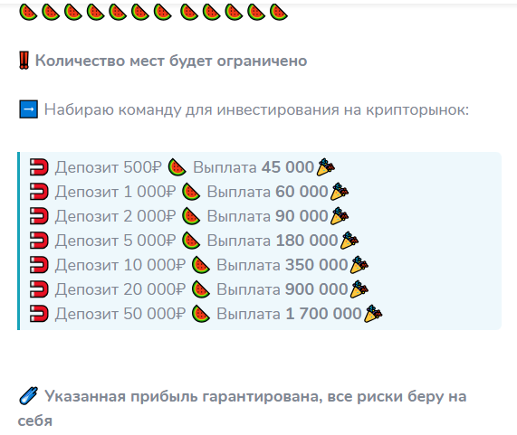 - минимальный вклад для сотрудничества составляет 500 руб., а обещанная выплата за данный взнос – 45 000 руб. С ростом капитала суммы, которые Елена “гарантированно выплатит”, растут как на дрожжах;