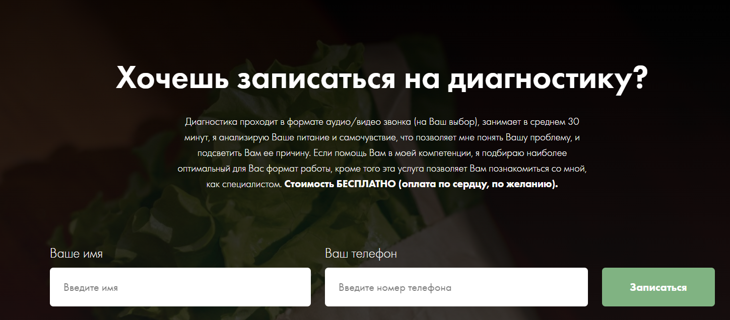 На сайте много прогрева через ситуации из жизни, акценты на стрессе, режиме сна и выборе продуктов, а также приглашения на диагностику и мини-программы.Есть тест в Google Forms, который выполняет роль воронки и через ряд вопросов ведет клиента на личную консультацию.