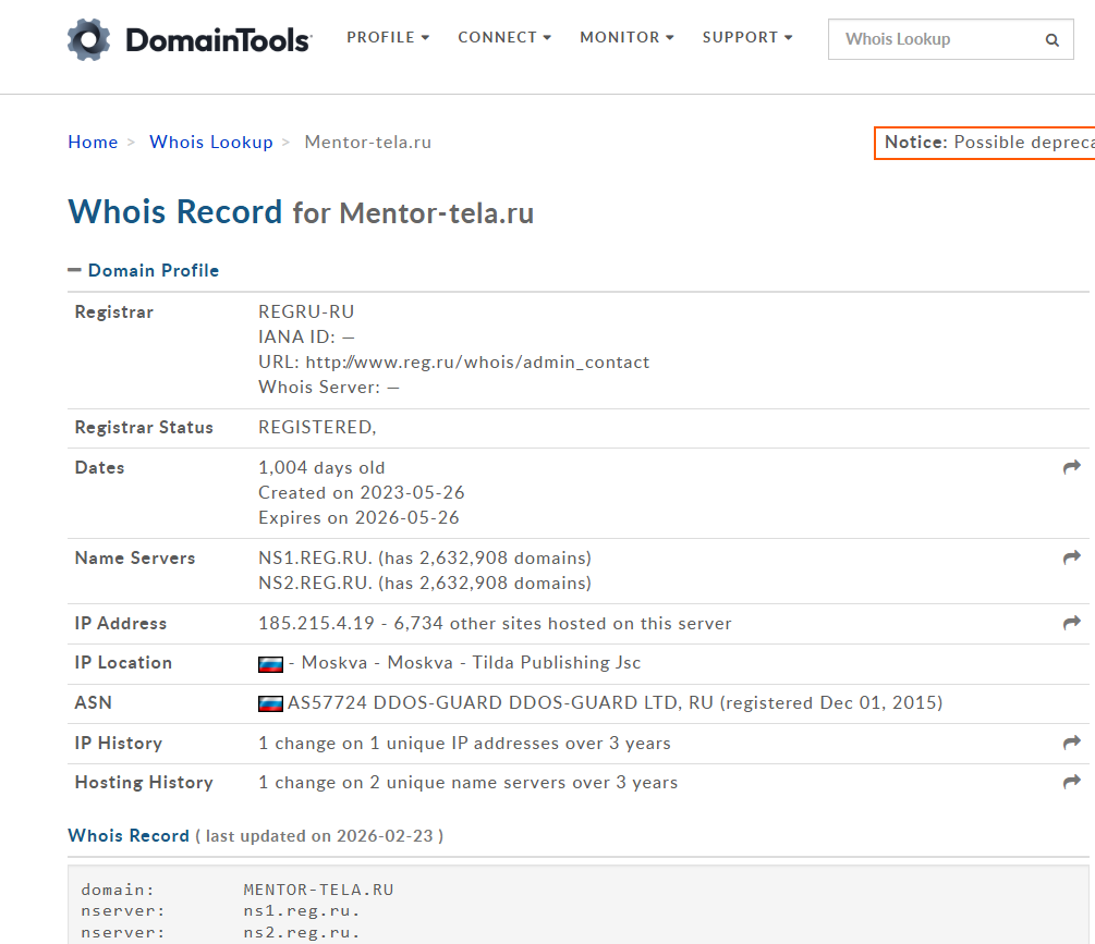 По данным Whois домен сайта Mentor tela ru был создан в мае 2023 года и на февраль 2026 года ему три года. Владелец сайта скрыт, а сам он на конструкторе Tilda.