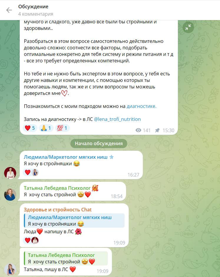 Если посмотреть на отзывы о Елене Трофимовой в «Телеграмме», то видно, что нет ни одного полноценного отклика о результатах прохождения программ. Под постами есть комментарии, но это слова пользователей о том, что они тоже хотят присоединиться или написали автору в личку.