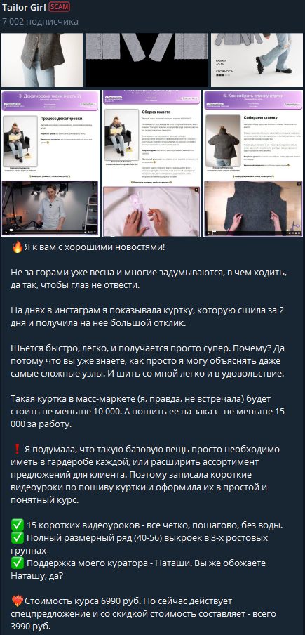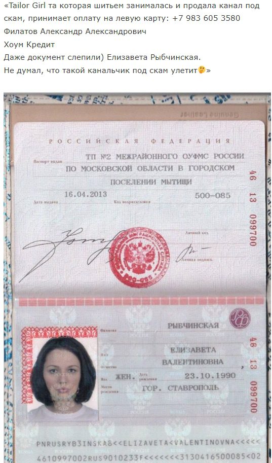 Сейчас закрепленное сообщение удалено, а канал получил скам-метку от модераторов Telegram. Предположительно, неизвестное лицо смогло получить доступ к t.me/tailorgirl_life и разместить пост о раскрутке капиталов, прикрыв незаконную деятельность сканом паспорта на имя Е. Рыбчинской.
