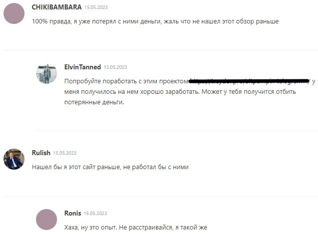 В Сети найден ряд комментов о бизнес-леди, которые с большой вероятностью относятся к взломавшему ее блог мошеннику. Можно предположить, что за время управления им А. А. Филатов все-таки успел развести нескольких трейдеров, однако гарантированно связать отзывы с Елизаветой Рыбчинской невозможно.