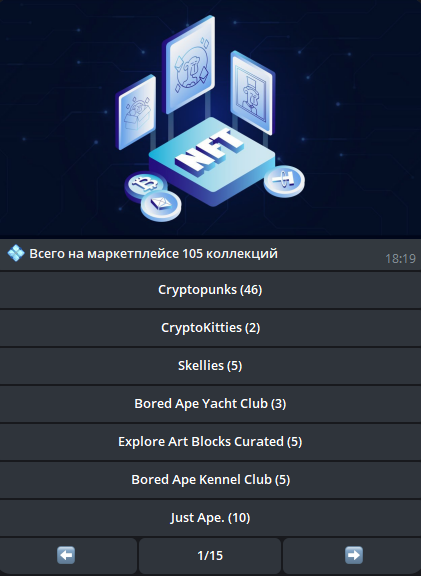 Сам бот Ematrix NFT очень похож на шаблонную разработку, в мессенджере работает множество идентичных сервисов с другими названиями и логотипами. По сути это централизованный маркетплейс невзаимозаменяемых токенов из разных коллекций: Cryptopunks, Just Ape, Skellies и других.