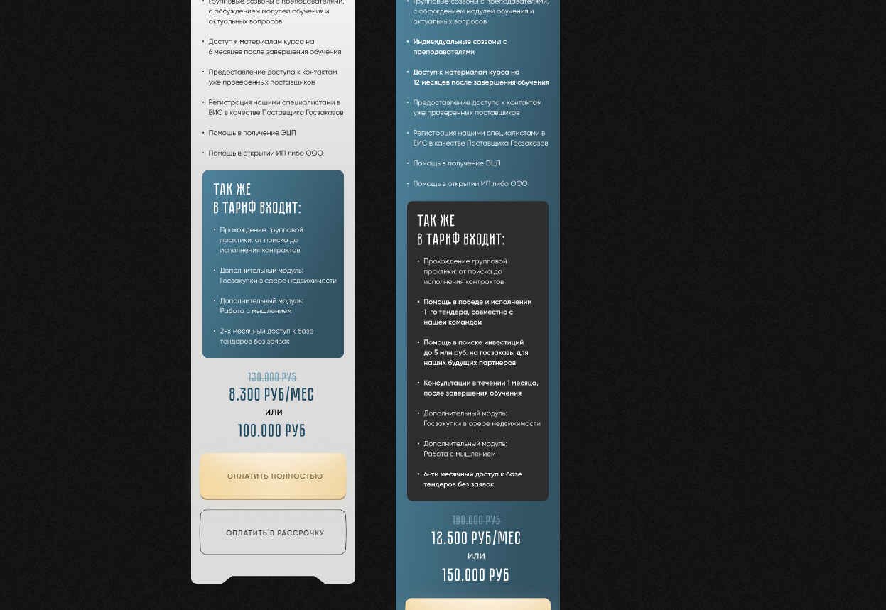 • “С исполнением тендера” стоит 150 т. р. или 12 500 р. в мес. Помимо вышеперечисленного, помощь в поиске инвестиций на 5 млн р., консультации 1 мес., новые доп. модули, помощь с исполнением 1 тендера. Доступ предоставляется на год после окончания курса.
