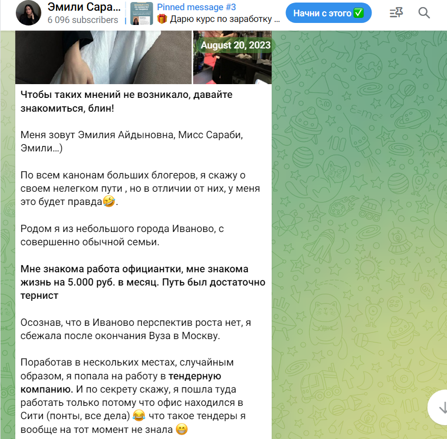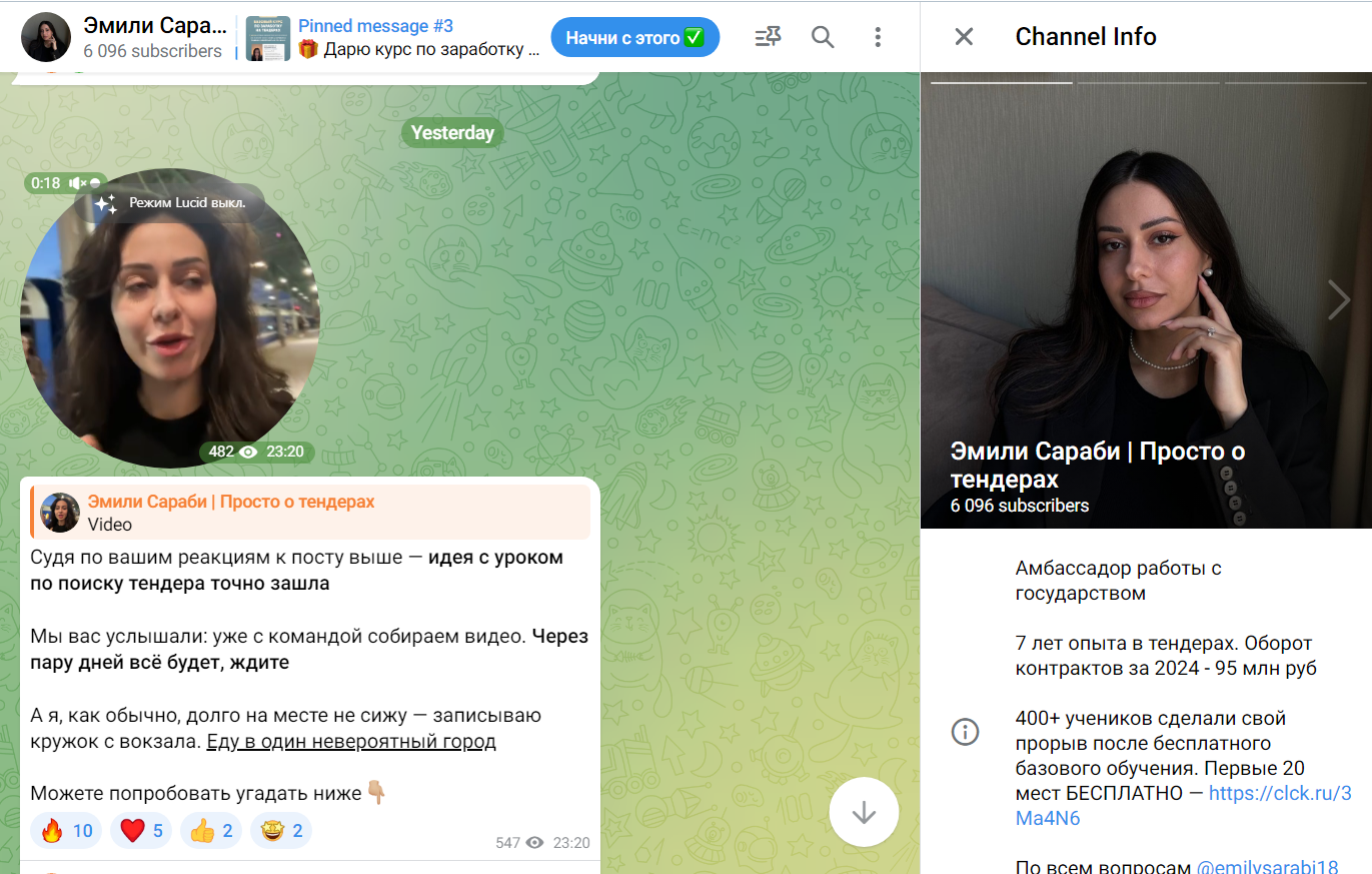 Спустя время решила открыть свою организацию в Сочи. За 1 месяц ей с командой удалось получить по 2 млн руб. на каждого. Сейчас уже 5 лет, как Эмили владеет крупной компанией и школой по тендерам. За 2024 год, как уверяет, оборот составил 95 млн руб., но верифицированных отчетов при этом нет. Сараби зарегистрирована как ИП, однако документов на проведение обучения не демонстрирует.