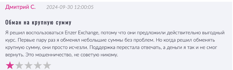 Обменник enzerexchange com отзывы получил негативные. Хотя заявляет об использовании новейших алгоритмов, гарантирующих безопасность переводов.