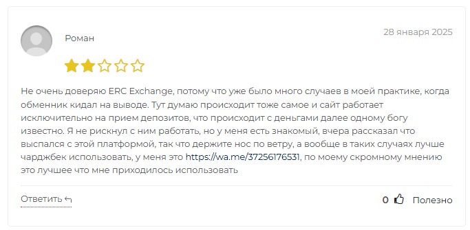 В интернете об обменники ERC Exchange отзывы только начинают появляться. Причем это отрицательные комментарии. Некоторые пользователи утверждают, что сайт работает только на прием депозита. В дальнейшем выплаты не происходят. Клиенты рассказывают, что мошенники после перевода указанной суммы начинают придумывать предлоги, чтобы выманить дополнительные средства.