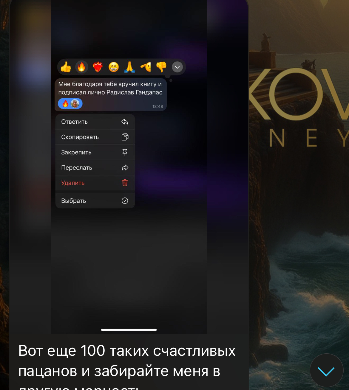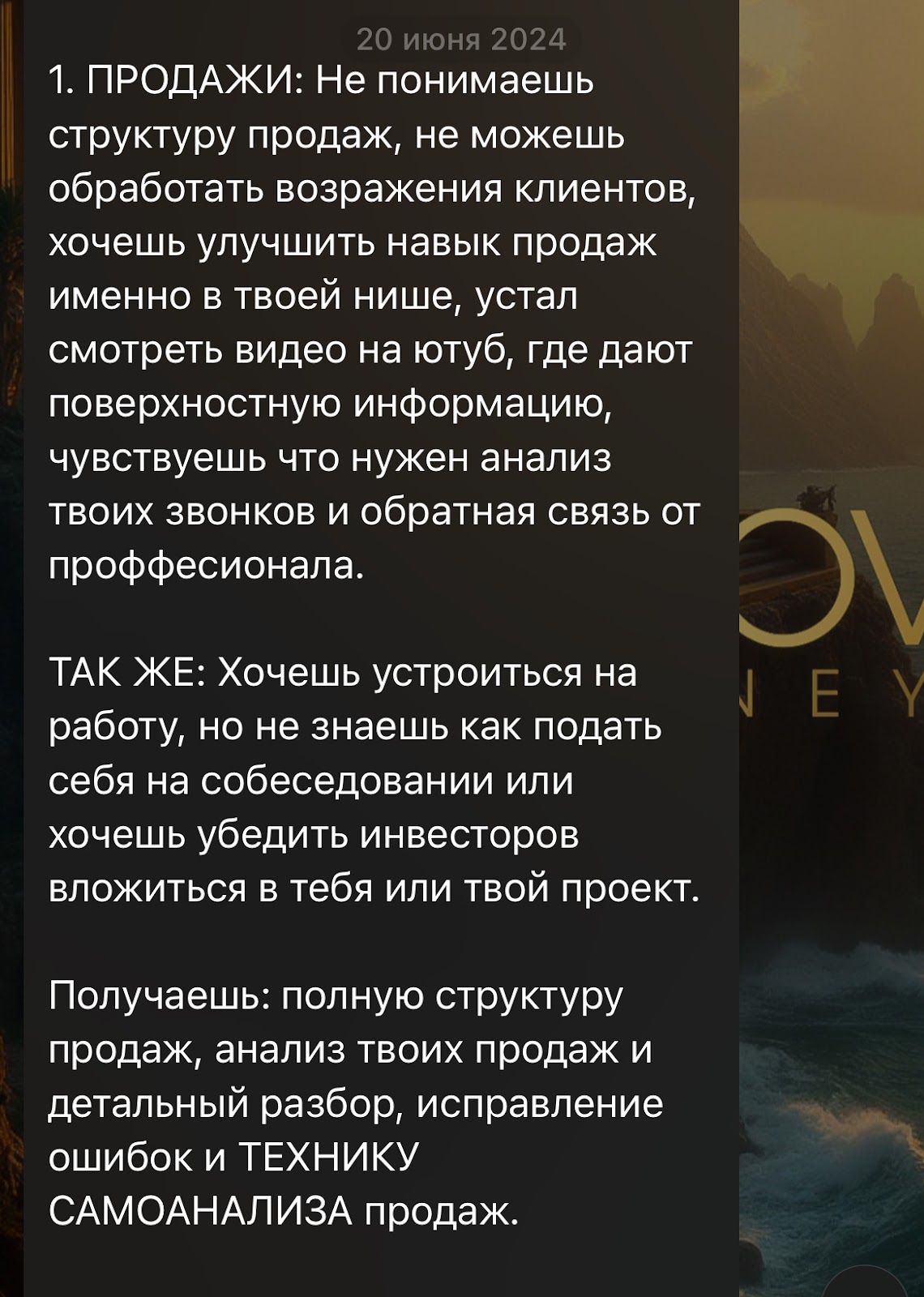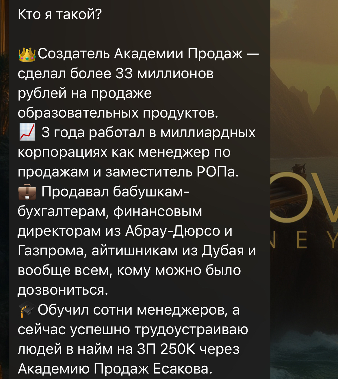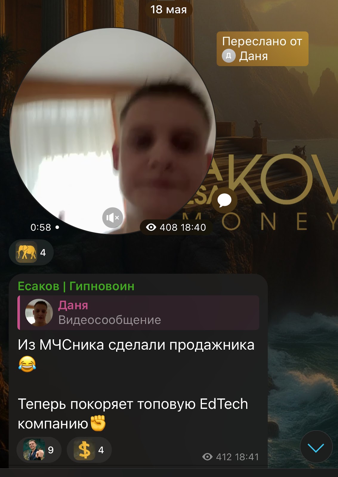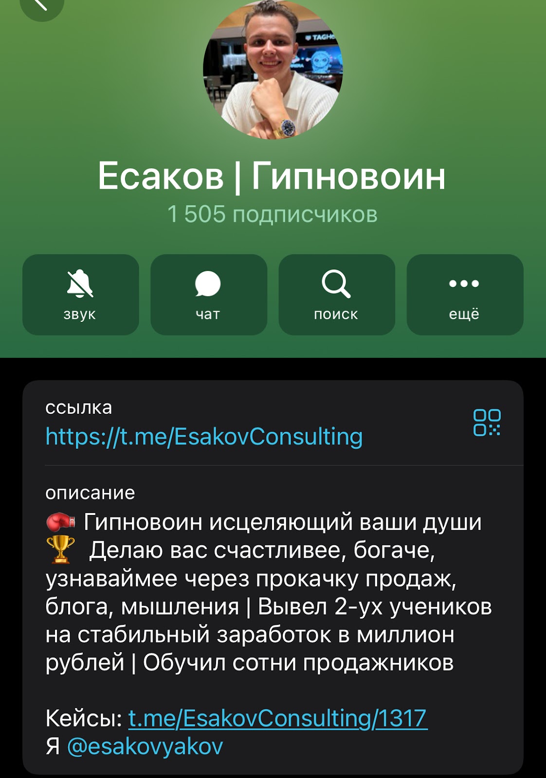 На телеграм-канал автора подписано 1505 человек. В описании указывается, что админ поможет сделать жизнь подписчиков лучше: увеличит заработок, разовьет мышление и «исцелит» души. Он оставляет ссылки на пост с отзывами и свой личный профиль — Esakovconsulting.