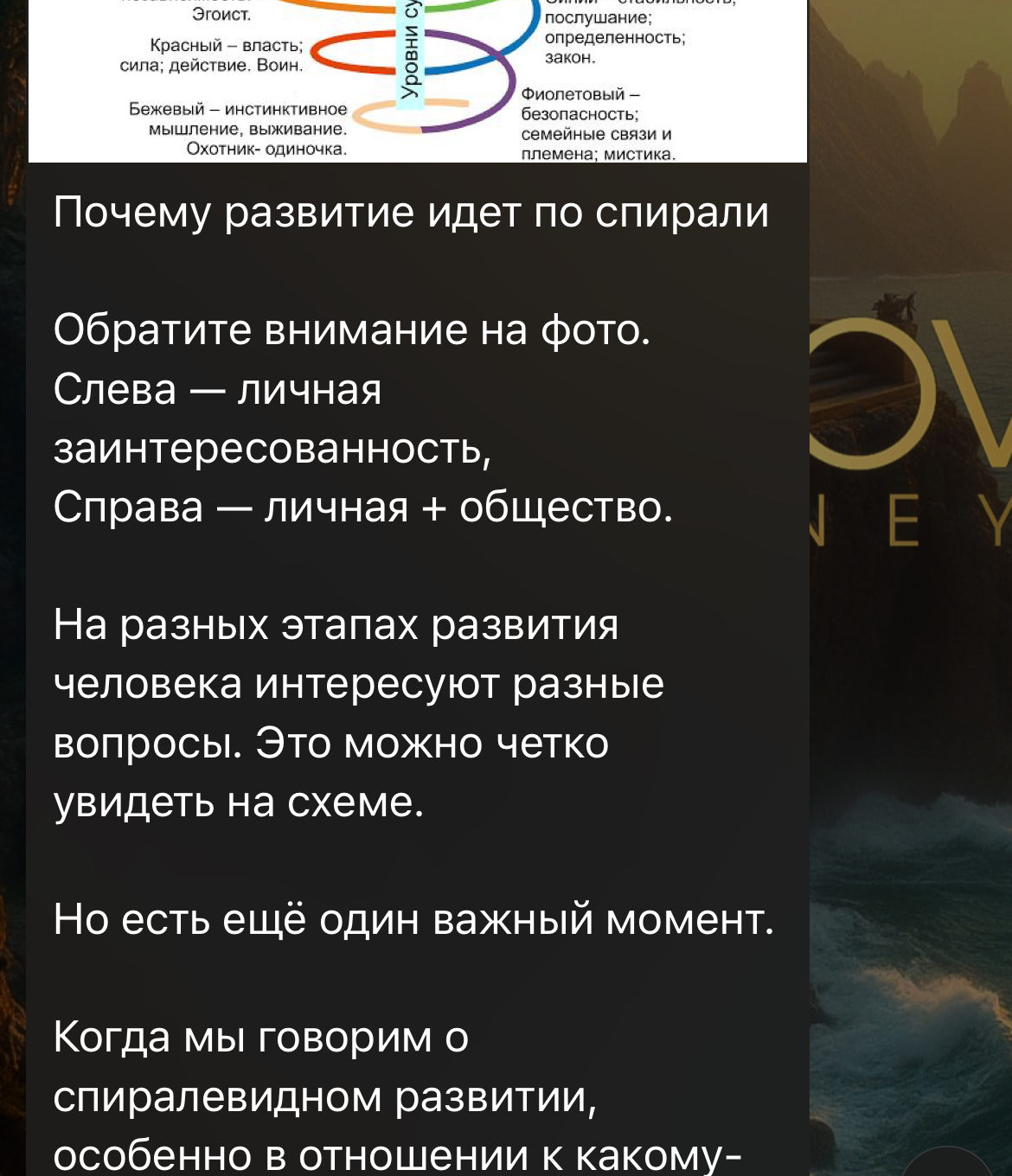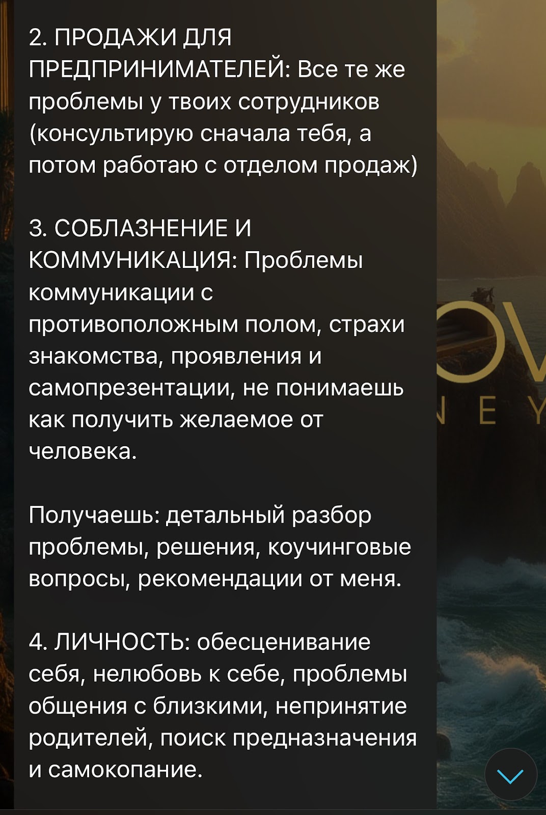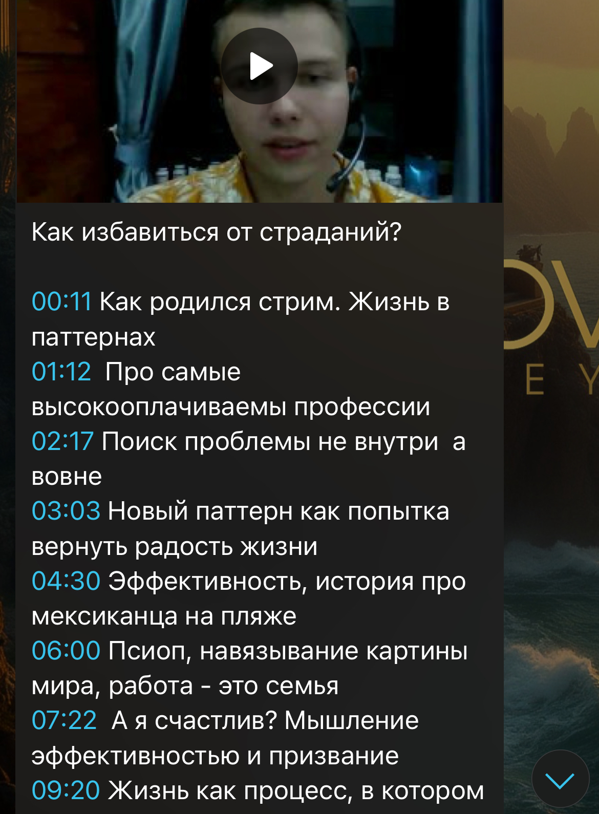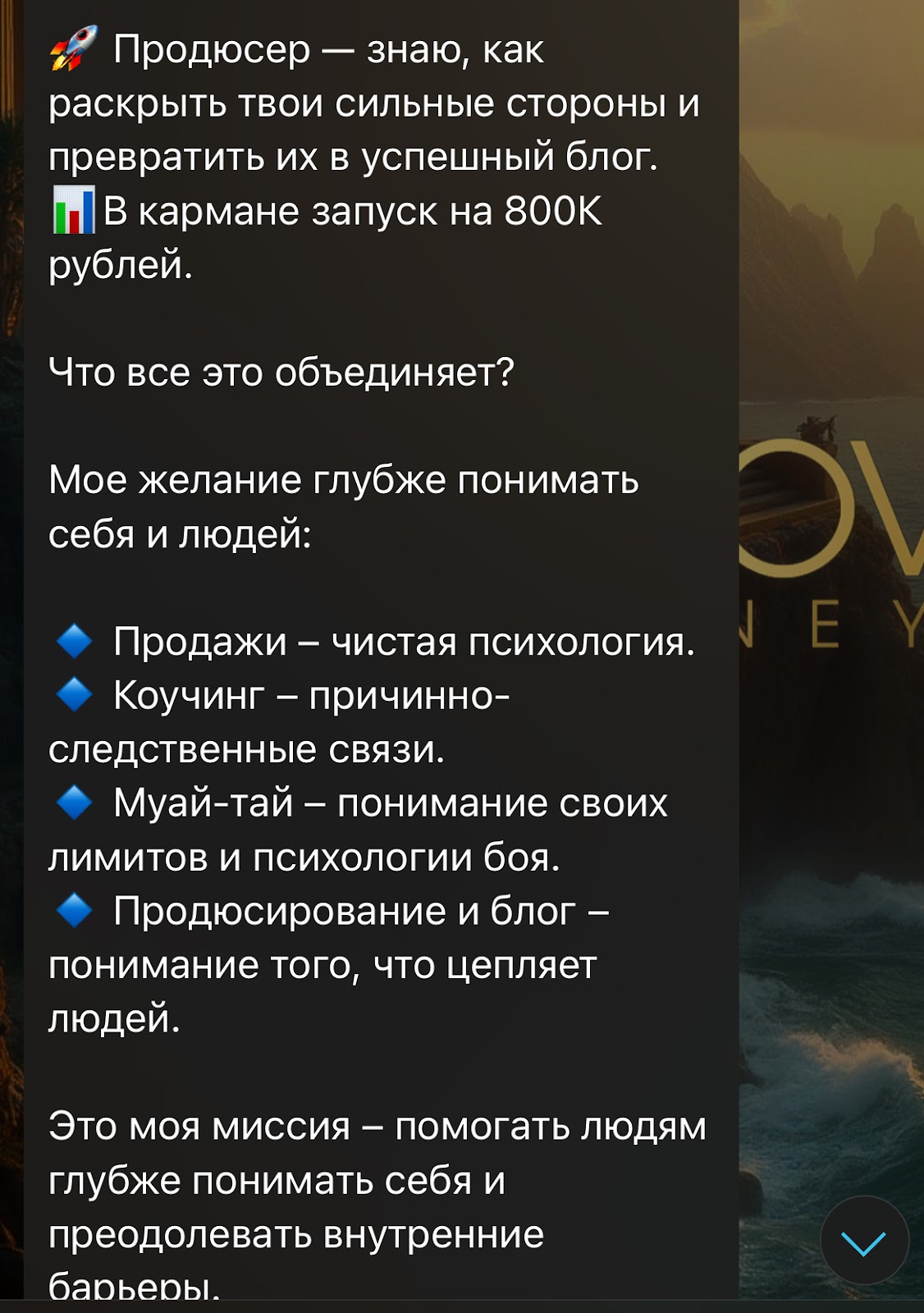 Помимо услуг в канале можно встретить советы и объяснения разных феноменов. Автор с точки зрения психологи разбирает аспекты человеческого развития и публикует гайды по улучшению качества жизни. Также здесь появляются записи прямых трансляций и подкасты.