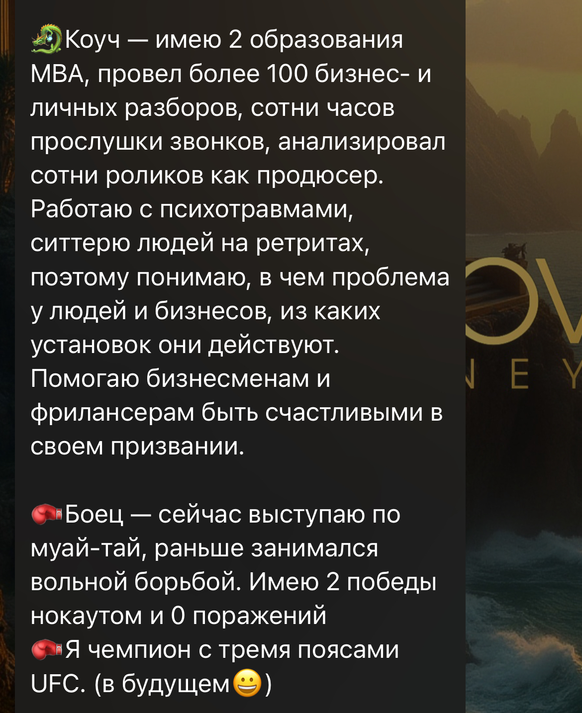 Также он заявляет об опыте в коучинге и психологии — свыше ста разборов разных ситуаций. Админ занимается муай-тай и выступает на боях. Еще указывается об обрыве в продюсировании проектов. Однако, ни одна из сфер не подкреплена доказательствами, что ставит под вопрос правдивость заявлений.