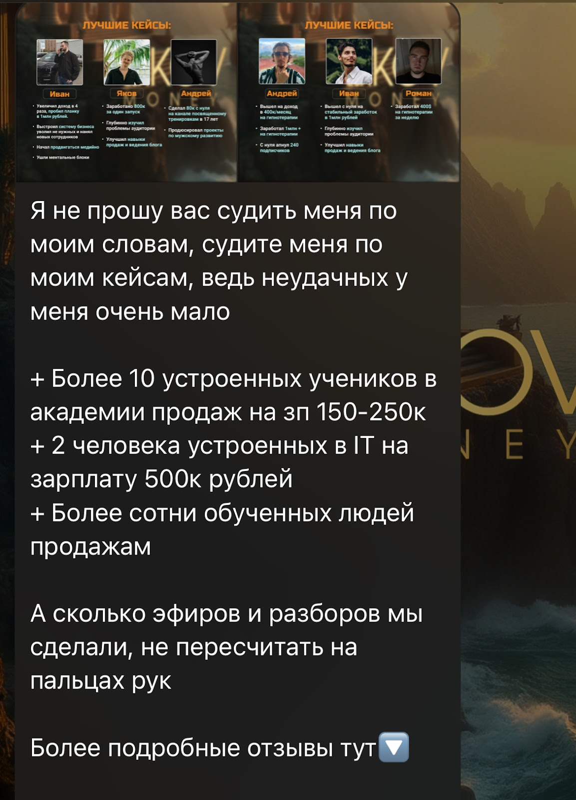 Внутри телеграм-канала есть посты с впечатлениями и достижениями клиентов. Здесь все оценки положительные. Пользователи благодарят автора за помощь в развитии: благодаря ему некоторые открыли свое дело и устроились на хорошие должности. Однако, такие отзывы могут накручены ввиду отсутствия ссылок. Также есть вероятность проплаченных сообщений. Из-за этого доверие к ним может упасть