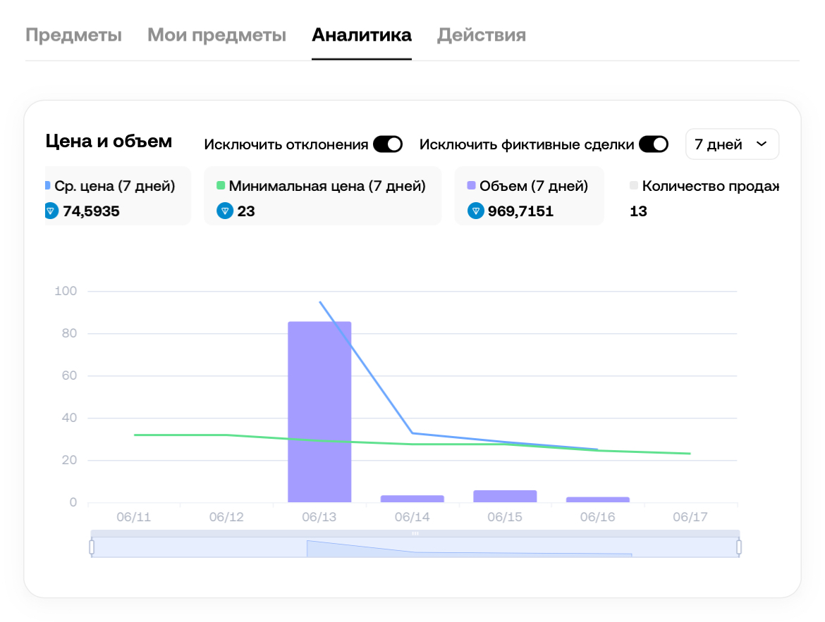 Средняя цена Eternal rose telegram за последнюю неделю — 11.06.2025-18.06.2025, составляет 74,5935 TON. За этот же период объем был 969,7151 TON. Количество продаж — 13. Как видно на графике, с 13 июня стоимость резко снизилась с более 90 до ~25 TON. Минимальный прайс держится примерно на одном уровне, однако тоже уменьшился на ~5 TON.