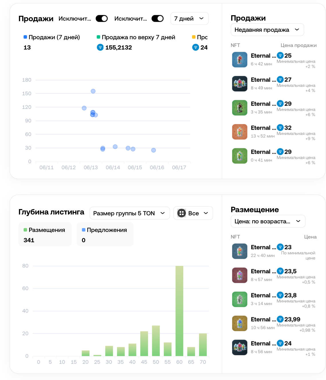 Опубликовано 341 размещений, 0 предложений. Критерий — размер группы 5 TON. На сайте можно видеть последние продажи и размещения Eternal rose тг. Рядом с активами публикуется дата загрузки и приобретения, минимальная цена плюс разница.Указано распределение Eternal roses между держателями. Одним предметом владеет 63,31% пользователей, что говорит о средней популярности коллекции. На втором месте владение 4-10 предметами, на третьем — 2-3.