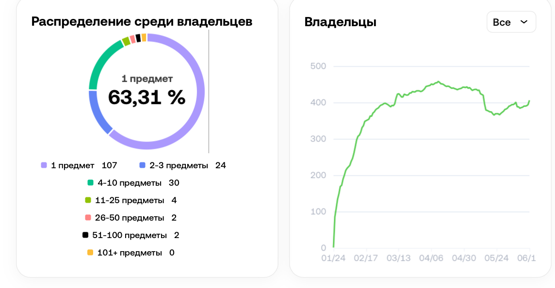 Информация о проекте есть на сайте криптобиржи OKX. Общий объем продаж составляет 13,3 тысячи TON, а минимальная цена — 23 TON. Указывается, что владеет набором 406 человек, из них 14,51 % — уникальные держатели. В разделе «Предметы» можно изучить каждую картинку и ее цену. Также можно отследить стоимость последней транзакции.