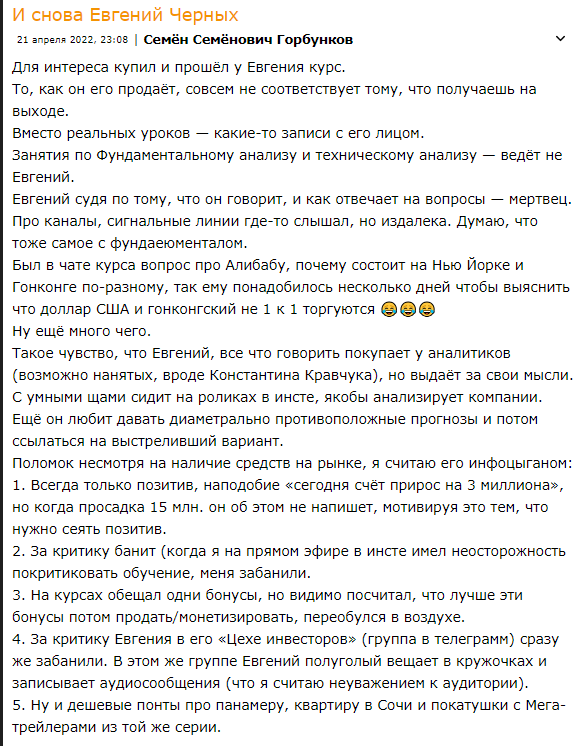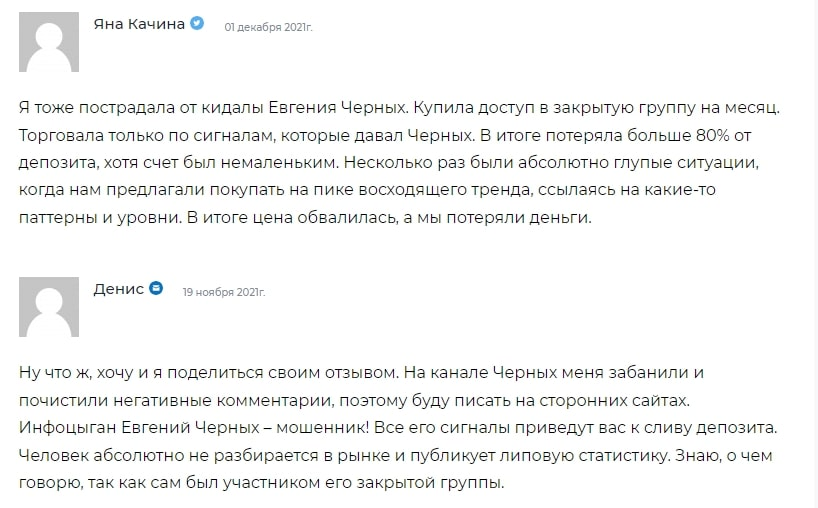 Отзывы о закрытой группе Евгения Черных на независимых ресурсах преимущественно негативные. Претензии пользователей связаны с низким качеством образовательного контента. Также есть жалобы на сигналы, благодаря которым клиенты сливают депозит. ТГ канал Клуб Инвестиций Евгения Черных тоже пользуется дурной славой. Дело в том, что наставник не спешит передавать свои знания ученикам, а на недовольство подписчиков реагирует неадекватно — удаление комментариев с претензиями, блокировка клиентов.