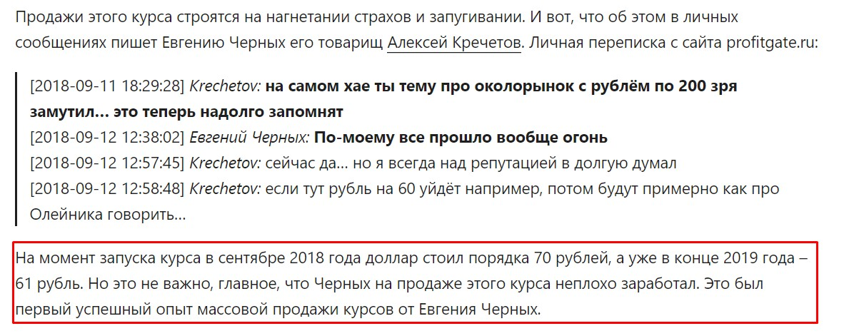 Евгений Черных — инфоцыган, толку от покупки его курсов или сигналов нет. Это слив денег и потеря времени, по словам его клиентов. Сотрудничество с наставником не рекомендовано. Если вы можете рассказать о своем опыте работы с Черных, напишите об этом в комментариях.
