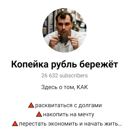 ТГ канал “Копейка рубль бережет” — третья площадка Евгения с аудиторией 26 000 человек. Проект нацелен на финансовую грамотность подписчиков, рассказывает, как экономить с умом и достигать финансовых целей.