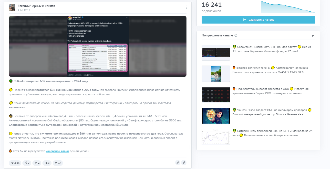 Криптовалютный канал трейдера посвящается рекламе обучающих курсов. Евгений называет себя Хозяин OZON. Ресурс с 16 000 подписчиков рассказывает о криптовалютных новостях, посты собирают около 50% просмотров, комментарии открыты, вовлеченность около 1% говорит о накрутке активности.