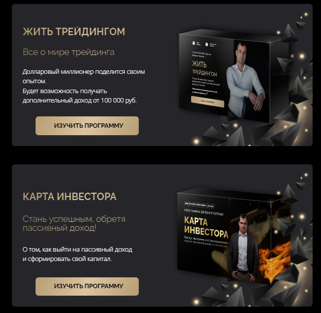 Можно выбирать и другие проекты: 5 СТРАТЕГИЙ ЗАРАБОТКА НА ОБЛИГАЦИЯХ, ГАЛАКТИКА ИНВЕСТИЦИЙ И ТРЕЙДИНГА ОТ ЕВГЕНИЯ ЧЕРНЫХ. Однако на них приостановлены продажи. Цены на все услуги переменчивы, могут дорожать, на какие-то продукты появляются акции. Актуальные стоимости можно узнать на сайте trader chernyh.