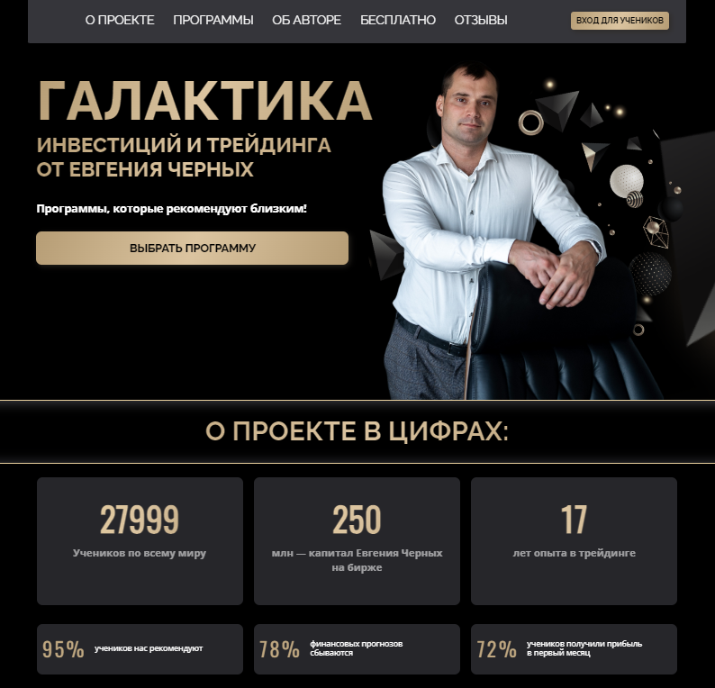 Отзывы об обучении трейдера Евгения Черных на независимых ресурсах преимущественно отрицательные. Пользователи жалуются на низкое качество торговых сигналов в закрытом клубе и слабую программу обучения. О себе наставник говорит как о долларовом миллионере, который свыше 17 лет занимается трейдингом и инвестициями. Позиционирует себя в качестве звезды российского трейдинга, является коучем и наставником с выпускниками по всему миру. О проекте traderchernyh ru Евгения Черных отзывы негативные, нет данных о доходности инвестора. В обзоре выясним, стоит ли доверять Евгению, или это очередной скам проект.