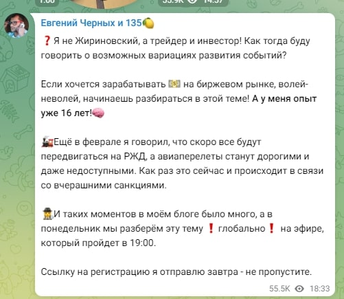 На Телеграмм канал трейдера Евгения Черных подписано свыше 140 тысяч пользователей. Название меняется в зависимости от депозита трейдера: ЕВГЕНИЙ ЧЕРНЫХ И 248, затем Евгений Черных и 380. В канале есть экономические новости, инвестиционные стратегии и мысли автора о рыночной ситуации. Посты собирают около 40-50% просмотров.