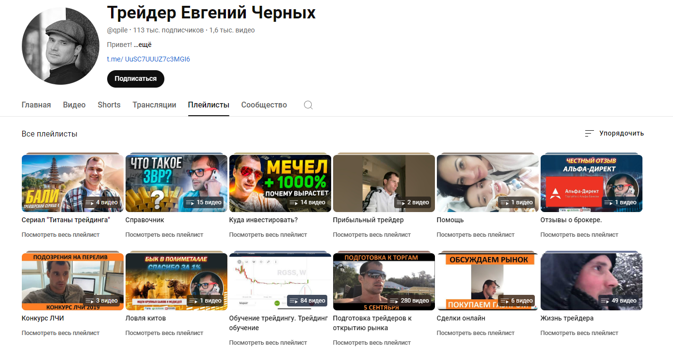 На Ютуб канал трейдера Евгения Черных подписано более 113 тысяч человек. Темы, которые наставник освещает на площадке:
