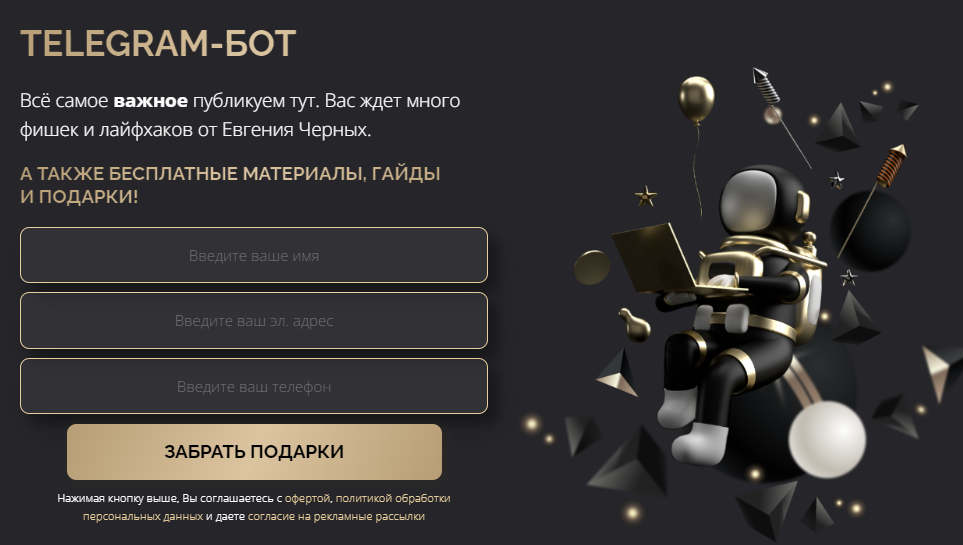 Электронная почта info kbrobotru предназначена для желающих предложить коллаборацию, партнеров, также здесь можно решить вопросы, связанные с оплатой тарифа. В Телеграмм боте traderchernyh bot пользователям доступны обучающие статьи, видео, секреты Черных и финансовые фишки от наставника. Все материалы бесплатны.