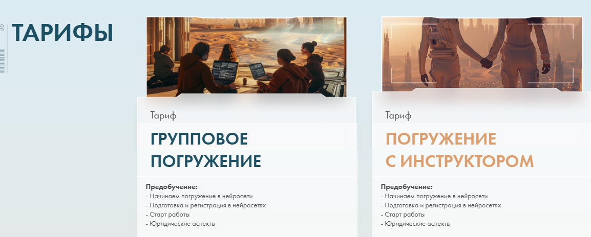 В ряде тарифов предлагаются дополнительные модули, воркшопы, стажировка и персональное сопровождение. Суть курса — практические навыки по применению ИИ-инструментов для создания контента и услуг.