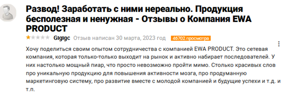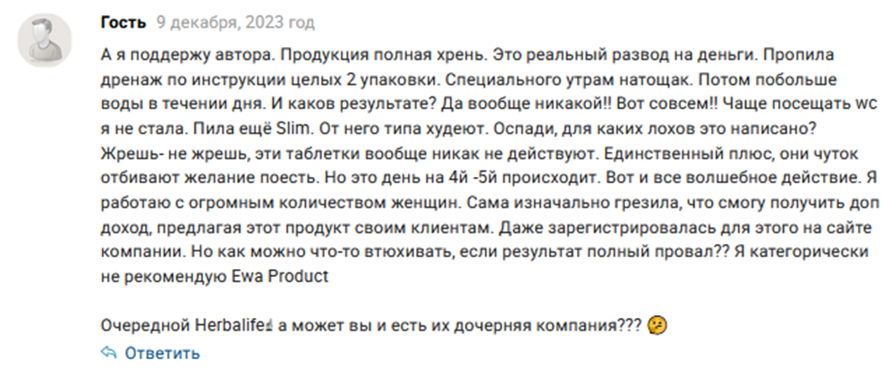 Такие реальные отзывы о продуктах EWA Product и особенностях работы в компании открывают неприятную для сетевика правду. Складывается впечатление, что EWA Product – это банальный лохотрон, который наживается на собственных представителях. Покупателям же просто впаривают совершенно бесполезный, а в некоторых случаях и потенциально опасный, продукт под видом чудодейственного средства.