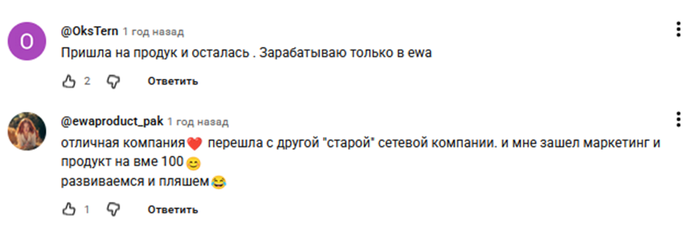 В сети можно найти различные отзывы о новой сетевой компании Ева Продукт. Часть комментариев положительные и чрезмерно восторженные. Такие отзывы о работе в EWA Product говорят, что сотрудники получают зарплату не меньше 70 тысяч, некоторые уже на 7 месяце сотрудничества с сетевиком получили бонусный автомобиль.Но многие тезисы сильно напоминают рекламные посты, доверять таким отзывам о компании EWA Product сложно. Среди подобных комментариев практически ничего не сказано об особенностях работы. Видно только восхваление сетевика и восторженные замечания о том, какие замечательные продукты выпускает компания.