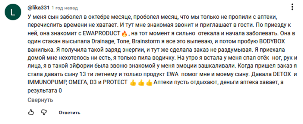 Отрицательные отзывы от реальных покупателей БАДов EWA Product подтверждают, что сотрудники магазина рекомендуют свою продукцию вместо лекарств. Это влечет за собой потенциальную угрозу здоровью. Особо опасными можно считать якобы реальные отзывы о Ева Продукт, которые рассказывают, что БАДы можно давать детям при различных болезнях.
