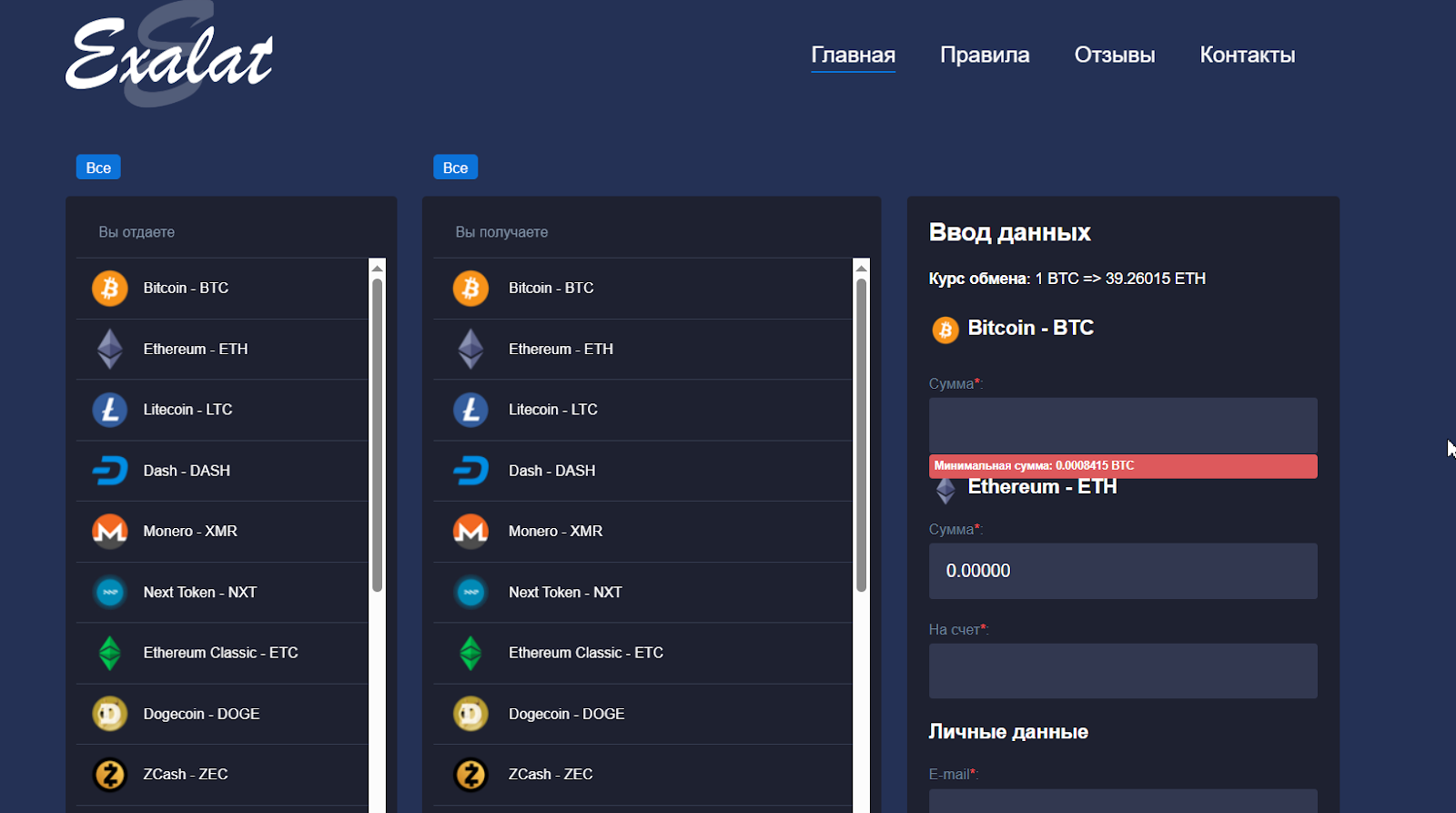 Exalat – обменник, о котором очень мало известно. Сайт выглядит просто, сделан он по шаблонному дизайну. Платформа состоит всего из четырех разделов, среди которых главная страница, правила сайта, контакты и отзывы. На стартовой странице сразу же можно увидеть форму для создания заявки и все направления обмена. Тут же можно оценить и проверить, по какому курсу платформа обменивает активы. С каждой стороны доступно порядка 25 направлений.
