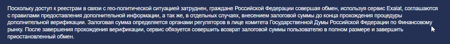 Комиссия за услуги обмена составляет 1% от суммы, сбор уже включен в курс при расчете. Однако, есть еще одно условие в правилах: проект имеет право в любой момент поменять тариф без уведомления об этом пользователя.Есть еще пара странных условий обмена, описанных в правилах сервиса. Обменник утверждает, что в некоторых случаях имеет право потребовать внесения залога для проведения операций. Якобы данное условие продиктовано комитетом Думы РФ по финансовым рынкам. Уточним, что вопросы движения криптовалюты сегодня государством не регулируются. Ни одного официального документа, утверждающего, что пользователи обязаны вносить залог, не существует.