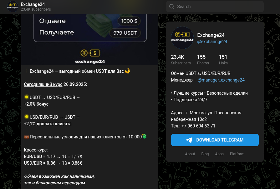 Главный же риск – полная анонимность и отсутствие правовой базы. У проекта нет ни юридического лица, ни лицензии на осуществление финансовых операций. Кто стоит за каналом – неизвестно. Телефон, указанный в профиле, виртуальный, а менеджер @manager_exchange24 – просто анонимный ТГ-аккаунт. В случае проблем предъявлять претензии будет некому и некуда.