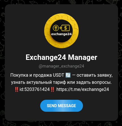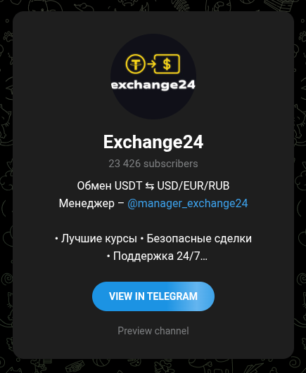 Exchange24 – это Телеграмм-канал и одновременно сервис по обмену криптовалют. Тут нам обещают выгодные курсы с бонусами, поддержку 24/7 и сделки не только онлайн, но еще и наличными через курьера. Для коммуникации с клиентами на проекте есть лишь один анонимный менеджер, а сама контора работает исключительно в рамках мессенджера. Подробнее об этом обменнике вы узнаете из нашего обзора – обсудим все риски и подводные камни.